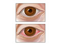 - Swelling of the upper eyelid. It may make the lid appear to droop (pseudoptosis).