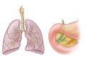 - Lungs and respiratory system. People with CF have thick and sticky mucus that traps bacteria. This causes lots of lung infections and often causes permanent lung damage. Bronchiectasis, which is caused by long-lasting airway inflammation, is common.