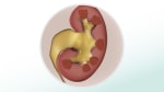 A kidney stone begins as a tiny piece of crystal in the kidney. When the urine leaves the kidney, it may carry the crystal out, or the crystal may stay in the kidney. If the crystal stays in the kidney, over time more small crystals join it and form a larger kidney stone.
