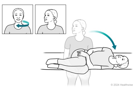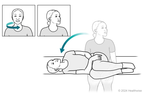 Turn your head about halfway (45 degrees) toward your right shoulder, and quickly lower yourself onto your left side. Your head should stay turned halfway toward your shoulder as you quickly lie down. Bring your legs up on the bed as you lie down.