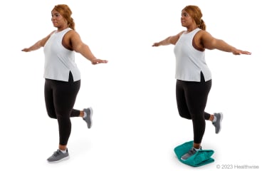 - Stand on a flat surface with your arms stretched out to your sides like you are making the letter "T." Then lift your good leg off the floor, bending it at the knee. If you are not steady, use one hand to hold on to a chair, counter, or wall.