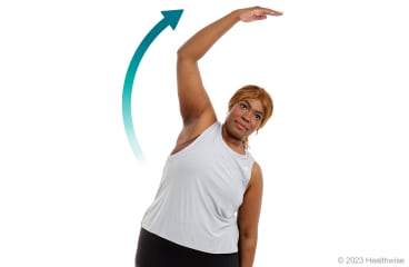 - Slide your hand down your leg as you let the weight of your raised arm gently stretch your side muscles. If you're sitting, keep your buttocks flat on the chair.