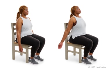 - Sit or stand up straight. If you're standing, keep your feet about hip-width apart.