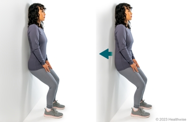 - Slowly slide down until your knees are slightly bent, pressing your lower back into the wall.