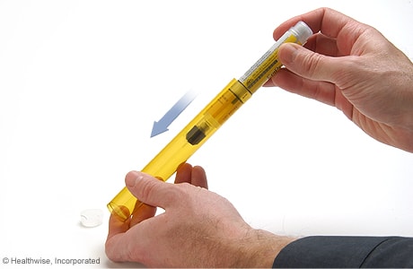 1. Grasp the injector in one fist with the tip pointing down. Follow the instructions for the injector closely. Each one has different steps for use.