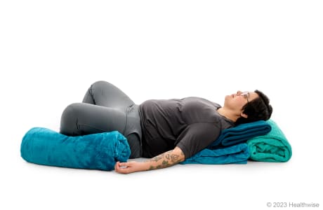 - Gently lower yourself backward toward the floor. Adjust the blankets as needed. Put your hands down on the floor by your sides, a few inches away from your body. Use blankets or pillows to support your arms in a comfortable position if needed.